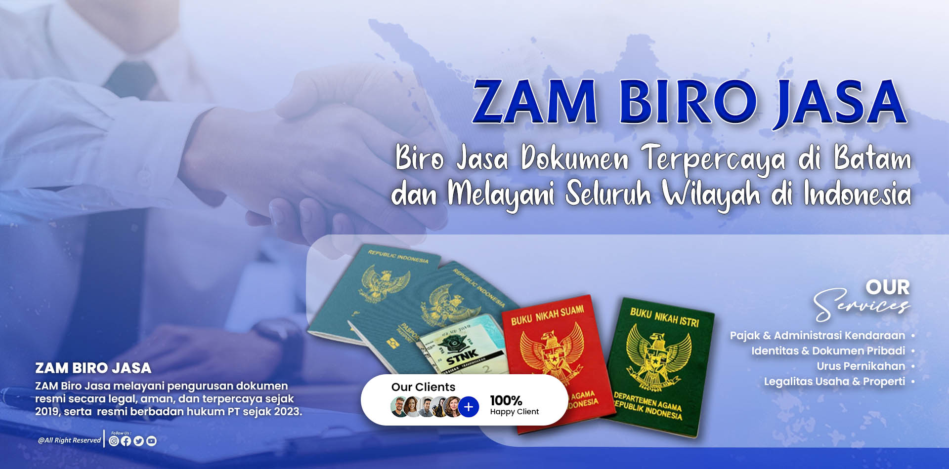 ZAM Biro Jasa mulai beroperasi pada bulan Maret 2019 sebagai penyedia layanan pengurusan dokumen resmi di Batam. Berkat kepercayaan masyarakat dan komitmen terhadap pelayanan yang jujur serta profesional, pada tahun 2023 kami resmi berdiri sebagai perusahaan berbadan hukum (PT).